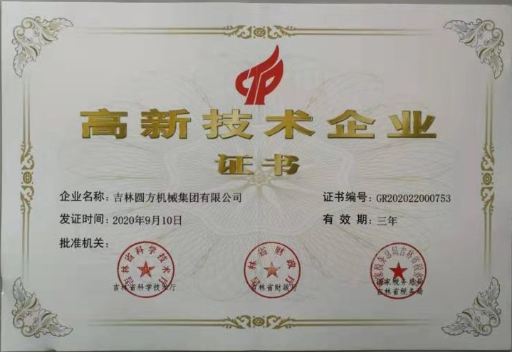 近日集團公司領取了《國家高新技術企業證書 》,標志著集團公司在技術研發和技術創新方面得到國家認可。今年,集團公司根據《國家高新技術企業認定辦法》和《高新技術企業認定管理工作指引》的有關規定,公司組織技術部、人力資源、財務部、信息中心等部門,開展了申報國家高新技術企業認定工作。經過專家評審及吉林省高新技術企業認定管理機構審查核定,全國高新技術企業認定管理工作領導小組辦公室批準。吉林圓方機械集團有限公司被認定為“國家高新技術企業”。